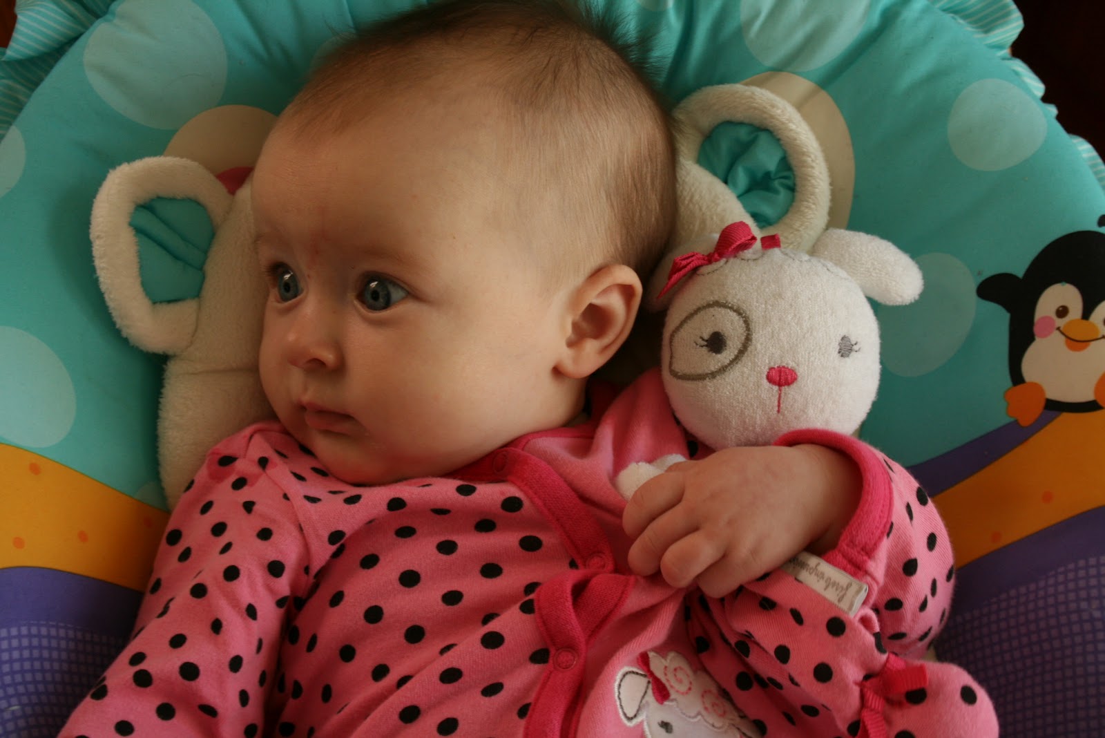 Besides that, she's been pretty happy during the day! She giggles when you kiss her cheeks and neck and blow raspberries on her. She will also smile back at you when you smile ... if she's in a good mood. Good moods normally last as long as you are holding her. She still doesn't like to be put down in anything for longer than about 10 minutes ... if you're lucky. When she's happy she also likes to squeal and talk to anyone who will listen. She has a multi coloured ball that is easy to hold that will fascinate her for a short time.